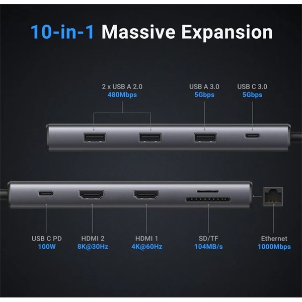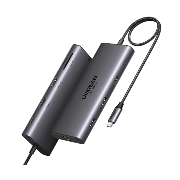 UGREEN Dokkoló állomás 10 az 1-ben, Dual Display, HDMI, Ethernet, 8K@30Hz, USB 3.0 HUB, 100W, SD card, szürke (15534)