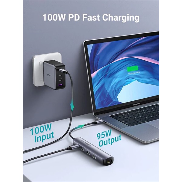 100W töltés: Akár 95W-os USB-C töltést is támogat a Type-C porton keresztül, hogy laptopod folyamatosan áram alatt maradjon. 5W a többi interfész működéséhez van fenntartva. A töltő és a töltőkábel nem tartozék. Képernyőtükrözés vagy fájlátvitel közben ne csatlakoztasd vagy húzd ki a PD töltőt, mivel ez képek vagy adatok elvesztéséhez vezethet.