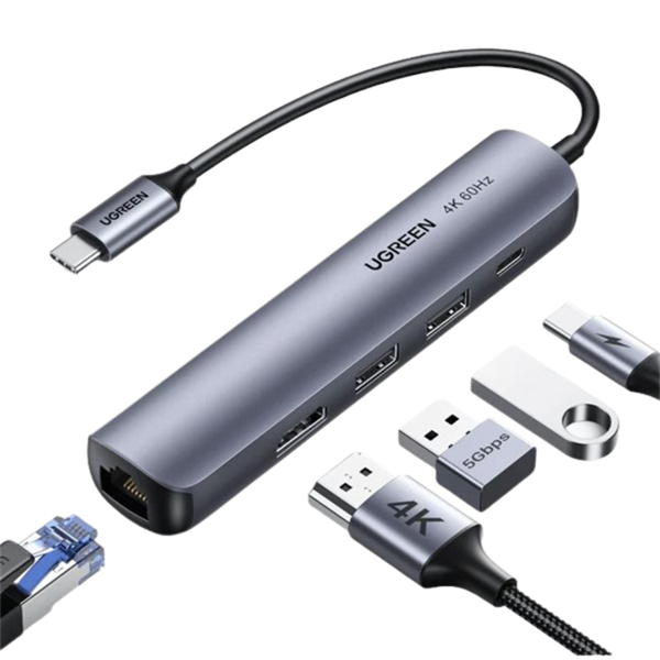 UGREEN Dokkoló állomás 5 az 1-ben, 4K@60Hz, USB HUB, HDMI 2.0, Ethernet, 3x USB-A, USB-C, 100W, szürke (10919)